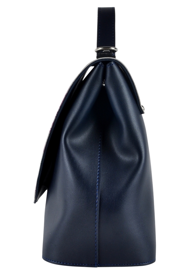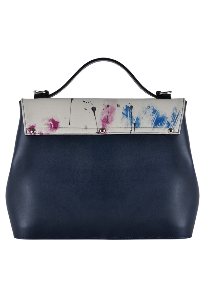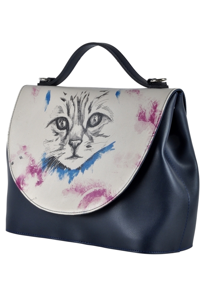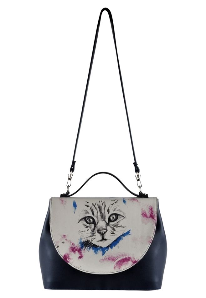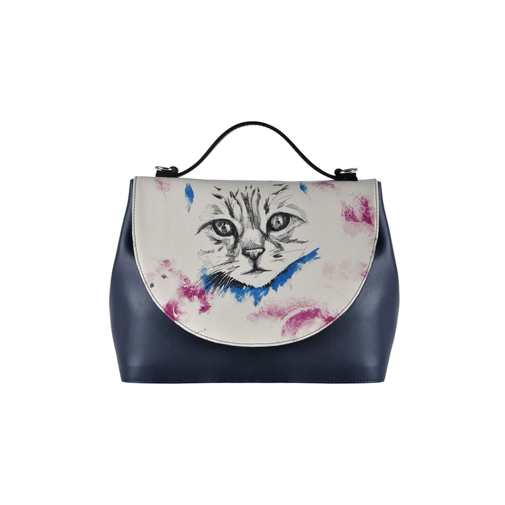 Handmade. Made of high quality polyurethane synthetic leather. The cover is digitally printed synthetic leather made of PVC. Shoulder straps with metal accents and with a comfortable handle grip. Inner lining is suede. Interior zipped pocket, safety lock under the cover. 31x24cm.
