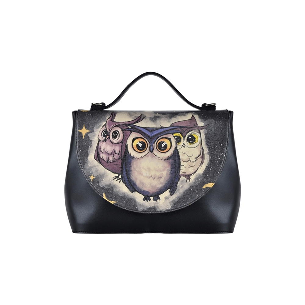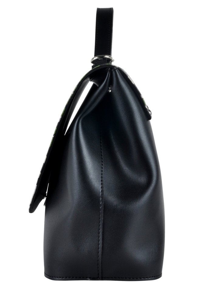 Handmade. Made of high quality polyurethane synthetic leather. The cover is digitally printed synthetic leather made of PVC. Shoulder straps with metal accents and with a comfortable handle grip. Inner lining is suede. Interior zipped pocket, safety lock under the cover. 31x24cm.