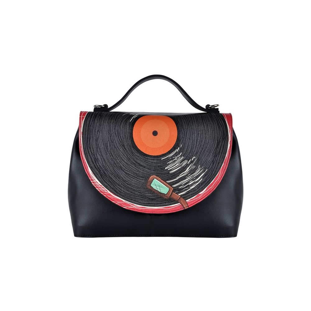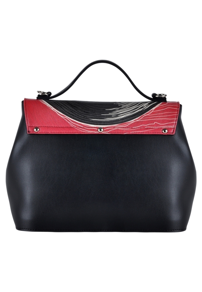 Handmade. Made of high quality polyurethane synthetic leather. The cover is digitally printed synthetic leather made of PVC. Shoulder straps with metal accents and with a comfortable handle grip. Inner lining is suede. Interior zipped pocket, safety lock under the cover. 31x24cm.